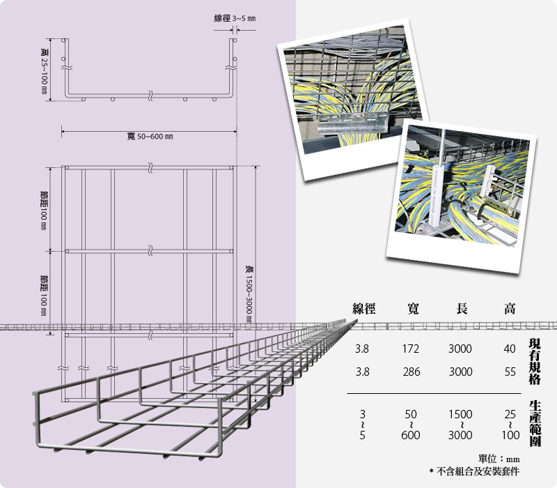 線纜支架主要以高抗拉之不銹鋼線或鍍鋅線焊接而成,專門適用於需要架設大量線纜的工作環境。開孔率大的孔徑除了能降低灰塵的累積,同時也有助於空氣的流通散熱。